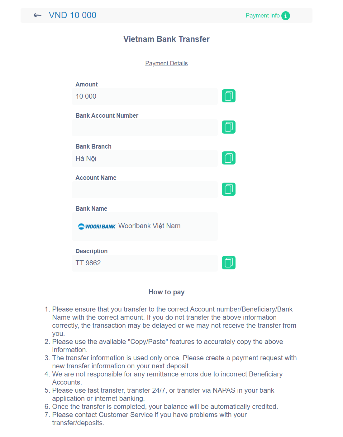 To learn more about performing purchases with the Bank transfers in Vietnam payment method by using Gate, see the Purchase by using Gate section.